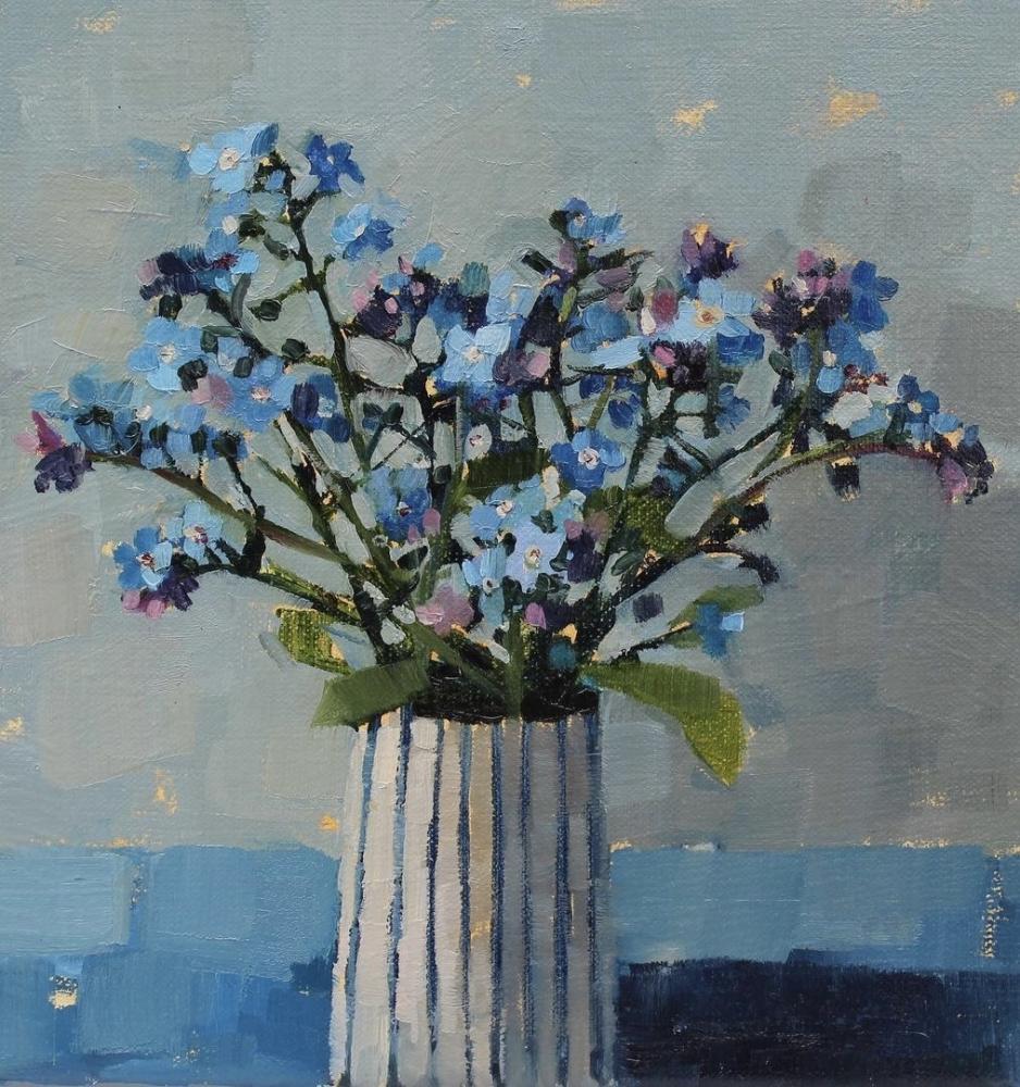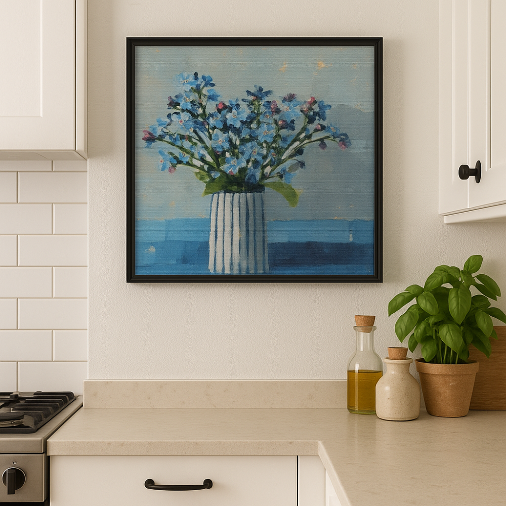 لوحة فنية تنبض بالحياة تصور باقة من الزهور الزرقاء الصغيرة في مزهرية مخططة بخطوط عمودية، بأسلوب تجريدي يعكس لمسة فنية راقية. الخلفية بألوان زرقاء وحيادية تضيف إحساساً بالسكينة،